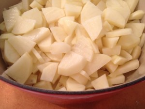 1. Peel potatoes, slice into thin pieces, and place potatoes into a large pot of cold water.  Bring to a boil and then turn down the heat and simmer for 20 minutes until cooked, but not mushy.