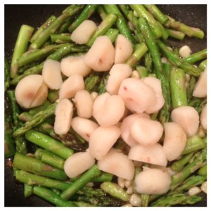 Add more olive oil to pan and saute the asparagus and water chestnuts till asparagus are tender.