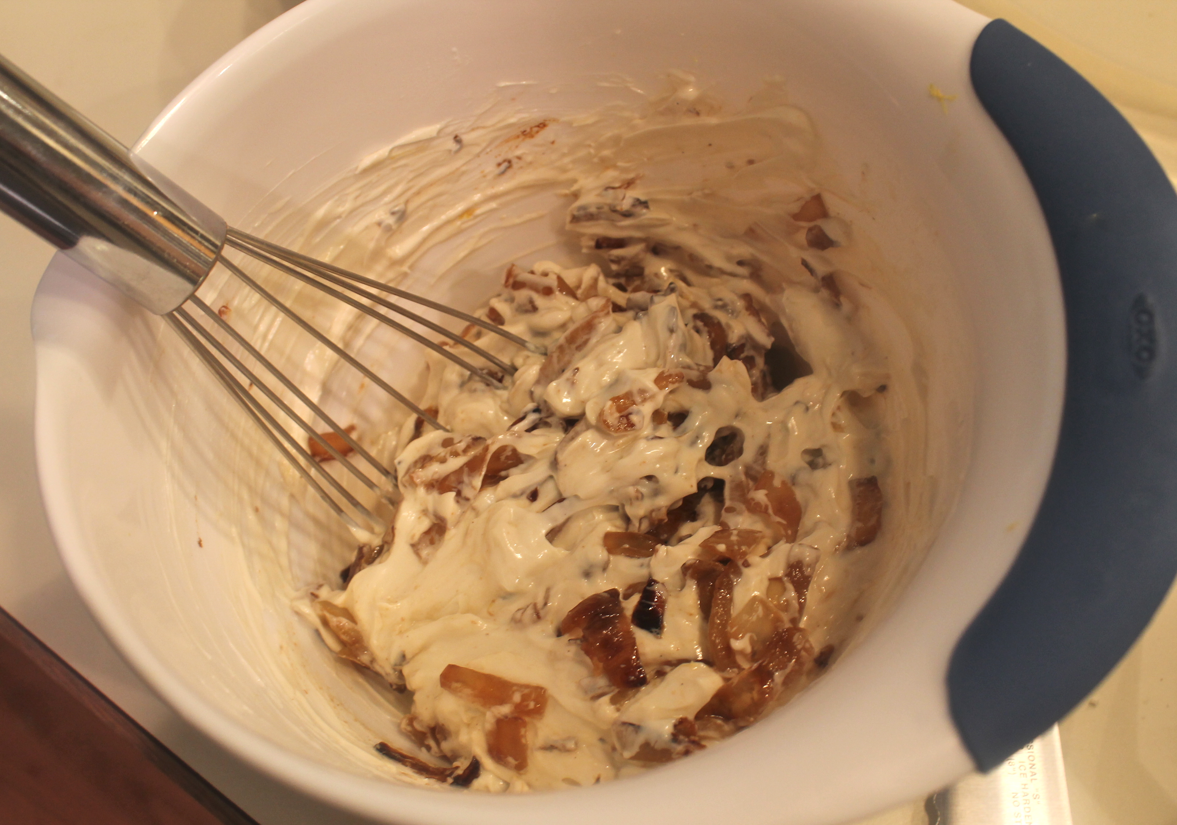 ~~ Good job- now add the cooled caramelized onions and mix well.  Back to the refrigerator for at least one hour.