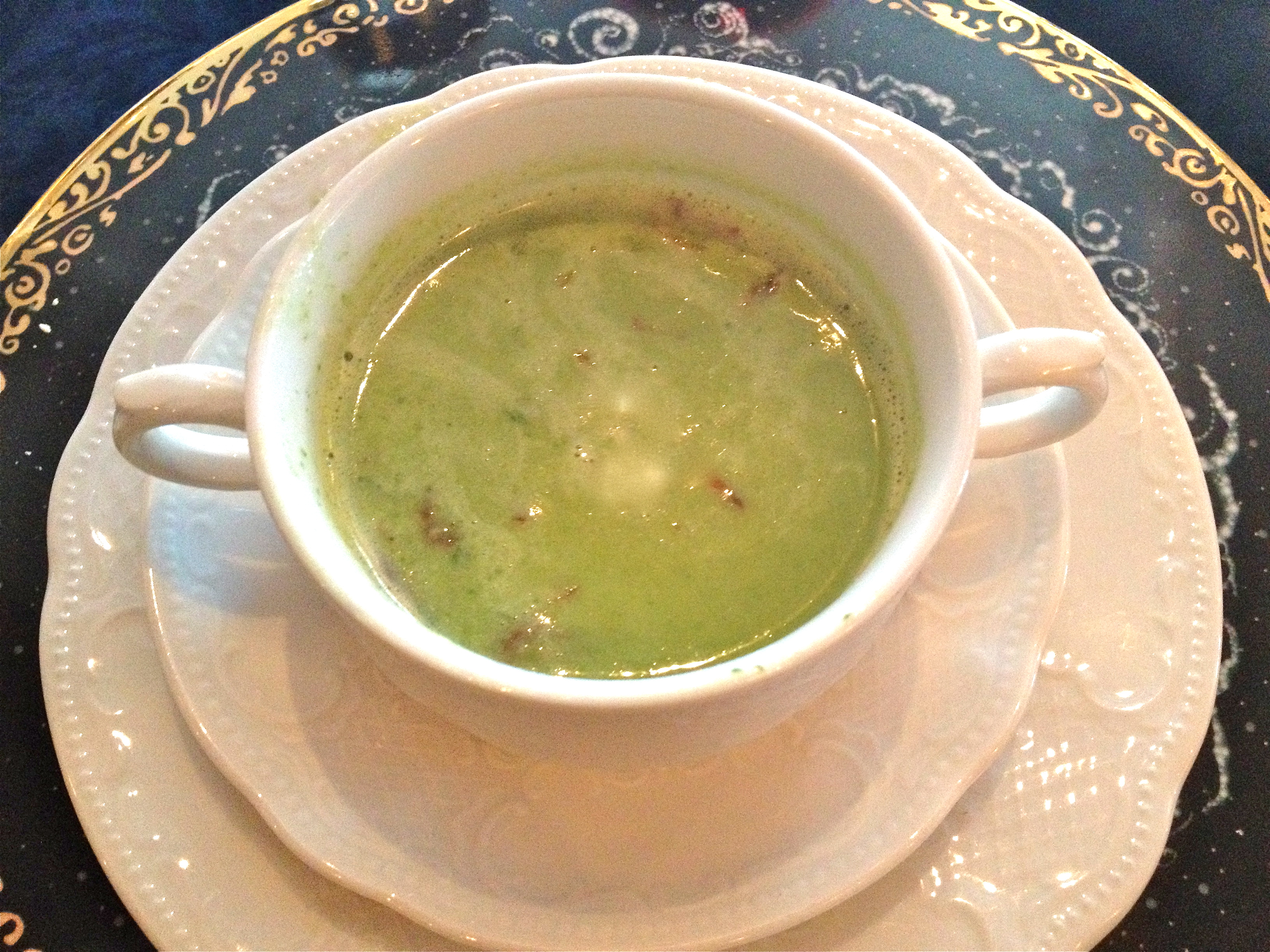 STARTER – “Green Split Pea Soup” with champagne and whole wheat croutons. This was a very rich, creamy split pea soup, minus the bacon. I thought I would miss the bacon, but the champagne gave it a lovely fragrant flavor with a slight citrus twist. Very different and something I will consider trying to replicate once we enter into Fall.