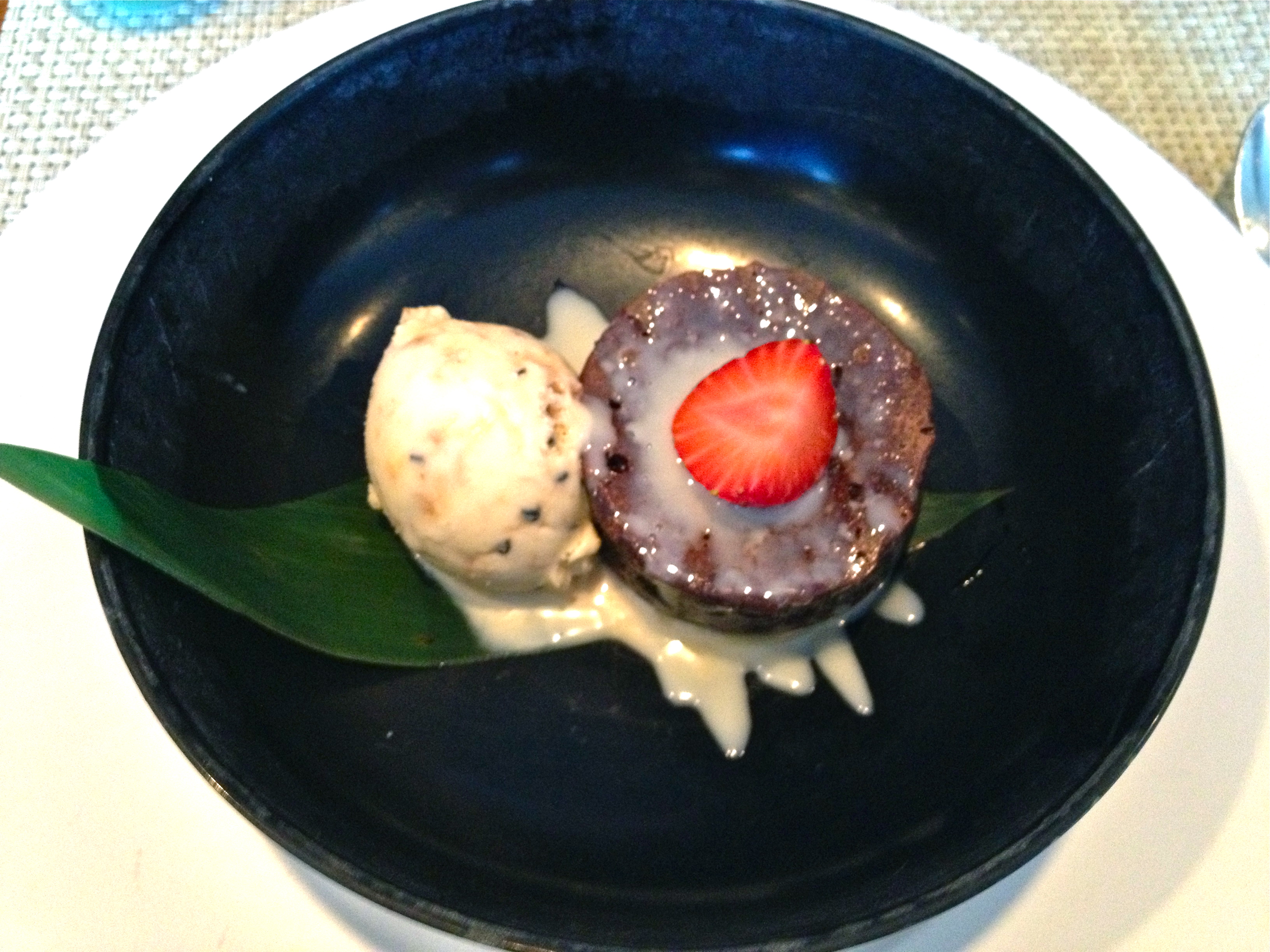 Chocolate Nougatine – Chocolate Nougat Mousse with Mocha Sauce Anglaise and Vanilla Ice Cream with Hazelnuts – Yum!!