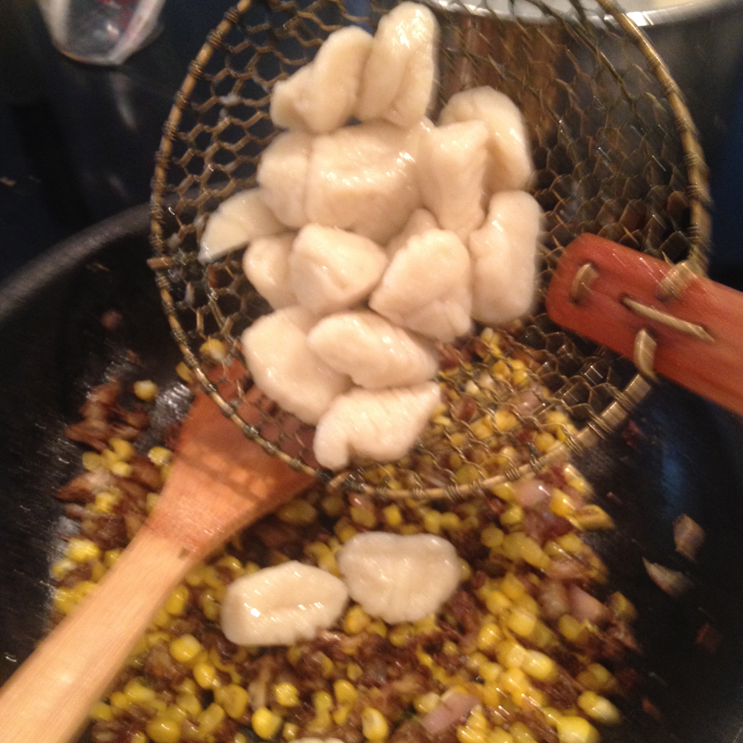 6. Reserve 1/2 cup of the pasta water and transfer the gnocchi with a slotted spoon or strainer to the pan with the corn and brown butter.